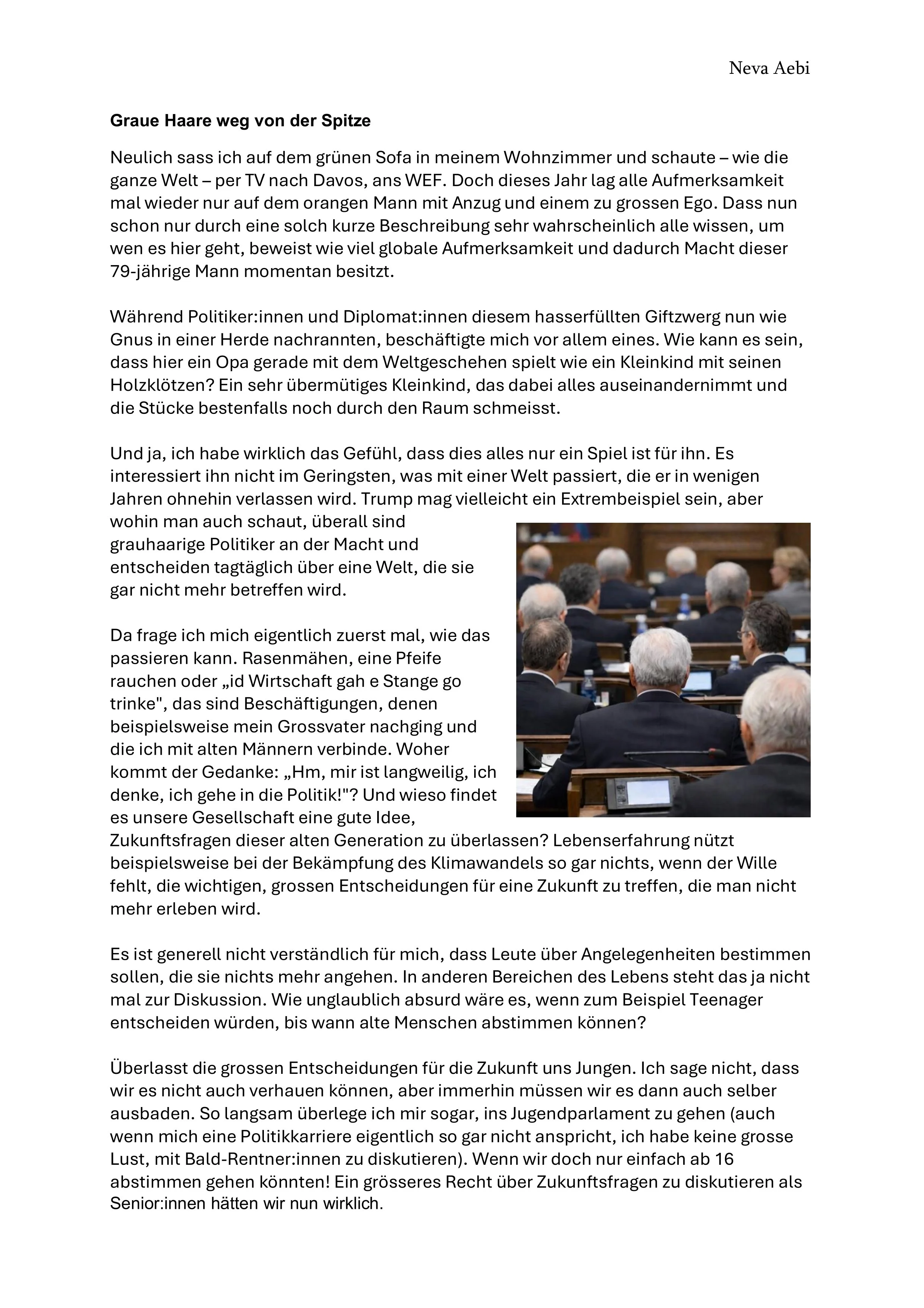Graue Haare weg von der Spitze Text 12. Feb. Verfasst von Jean-Pierre Ritler Von Neva Aebi / Klasse 4c, Literargymnasiums Rämibühl, Zürich / Februar 2026 Jean-Pierre Ritler http://www.jprmedia.info