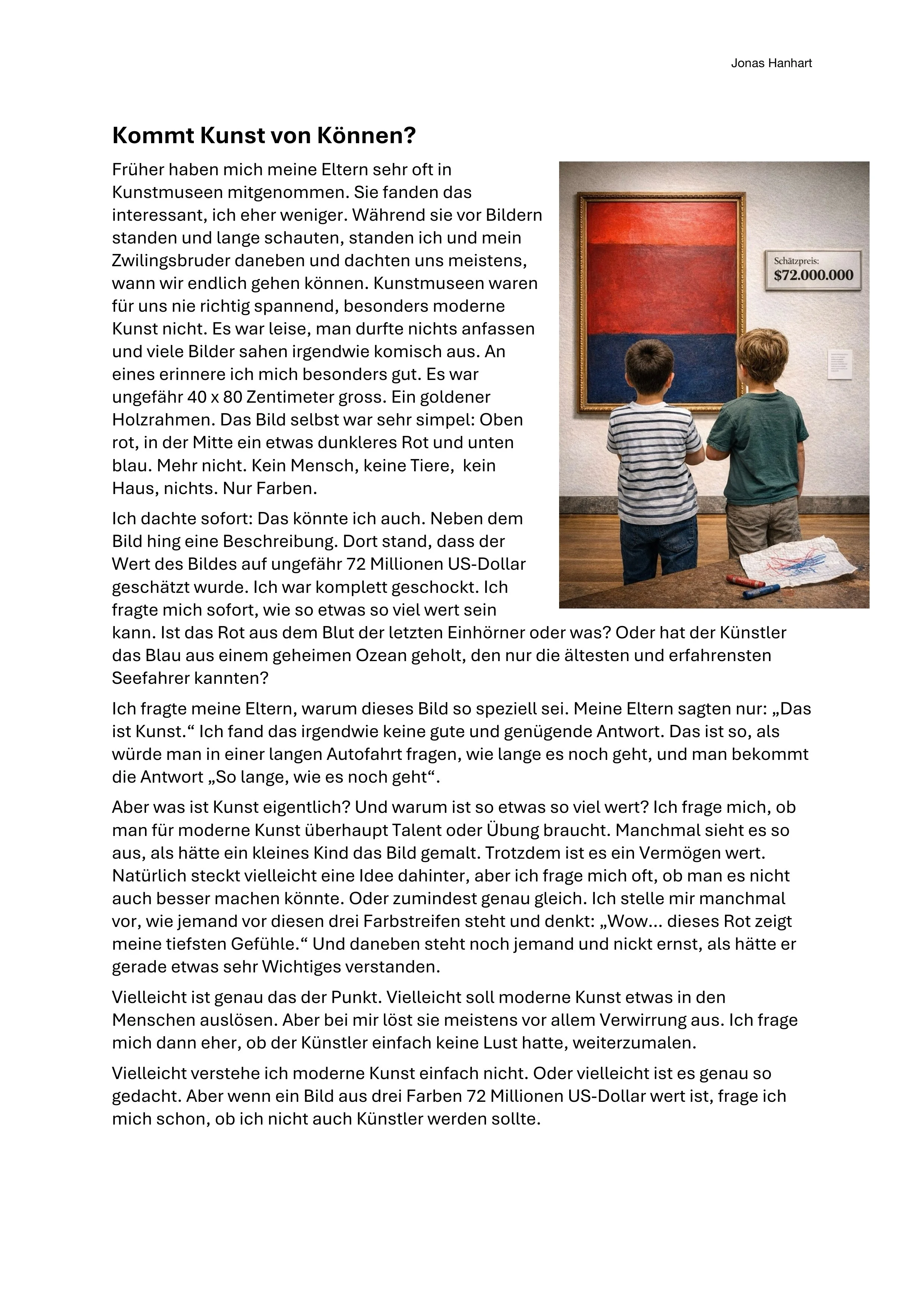 Kommt Kunst von Können? Text 12. Feb. Verfasst von Jean-Pierre Ritler Von Jonas Hanhart / Klasse 4c, Literargymnasiums Rämibühl, Zürich / Februar 2026 Jean-Pierre Ritler http://www.jprmedia.info