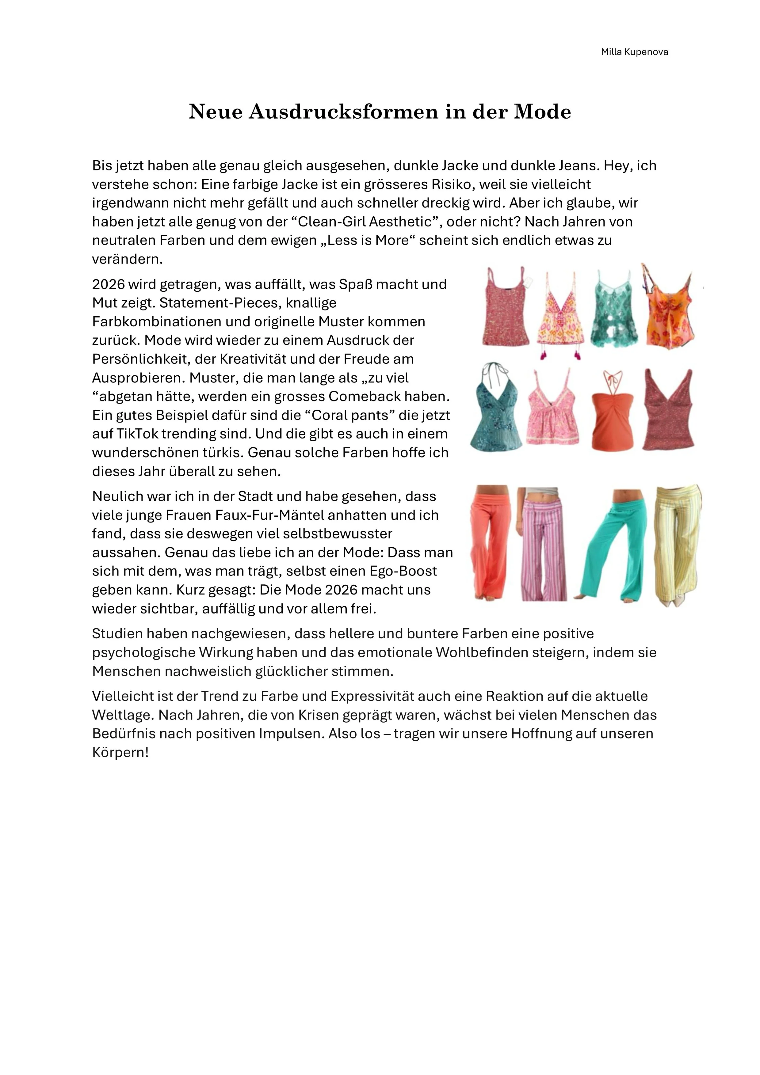 Neue Ausdrucksformen in der Mode Text 12. Feb. Verfasst von Jean-Pierre Ritler Von Milla Kupenova / Klasse 4c, Literargymnasiums Rämibühl, Zürich / Februar 2026 Jean-Pierre Ritler http://www.jprmedia.info