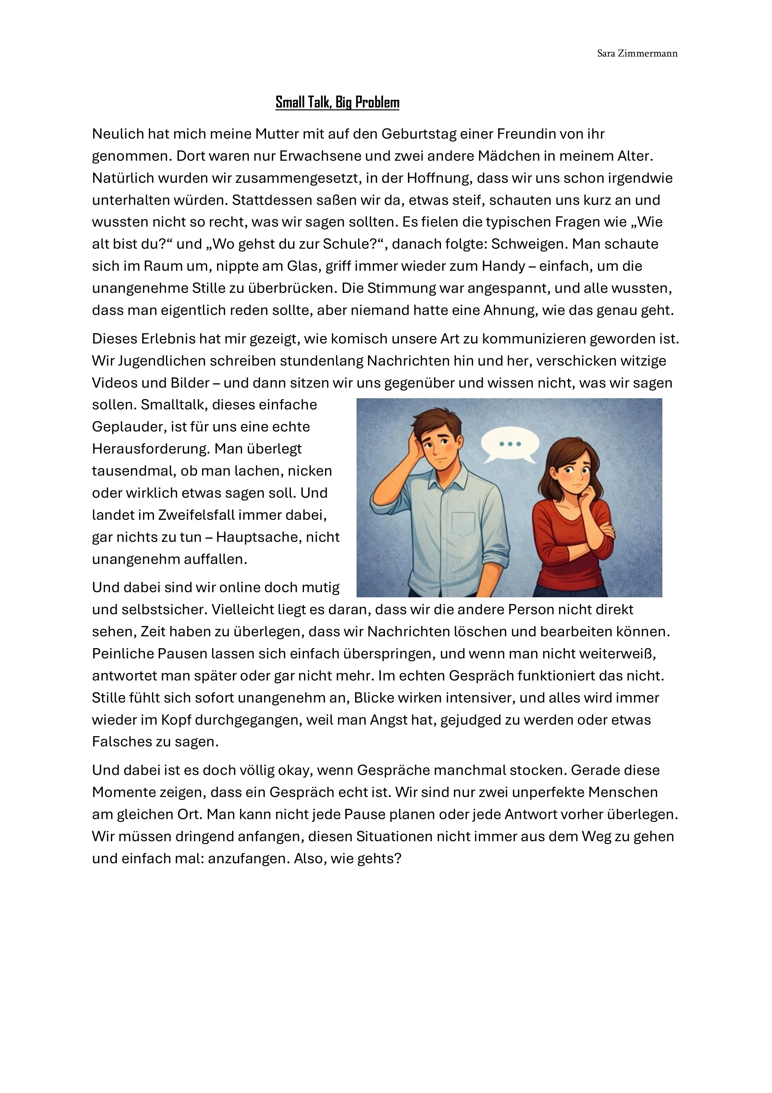 Small Talk, Big Problem Text 12. Feb. Verfasst von Jean-Pierre Ritler Von Sara Zimmermann / Klasse 4c, Literargymnasiums Rämibühl, Zürich / Februar 2026 Jean-Pierre Ritler http://www.jprmedia.info