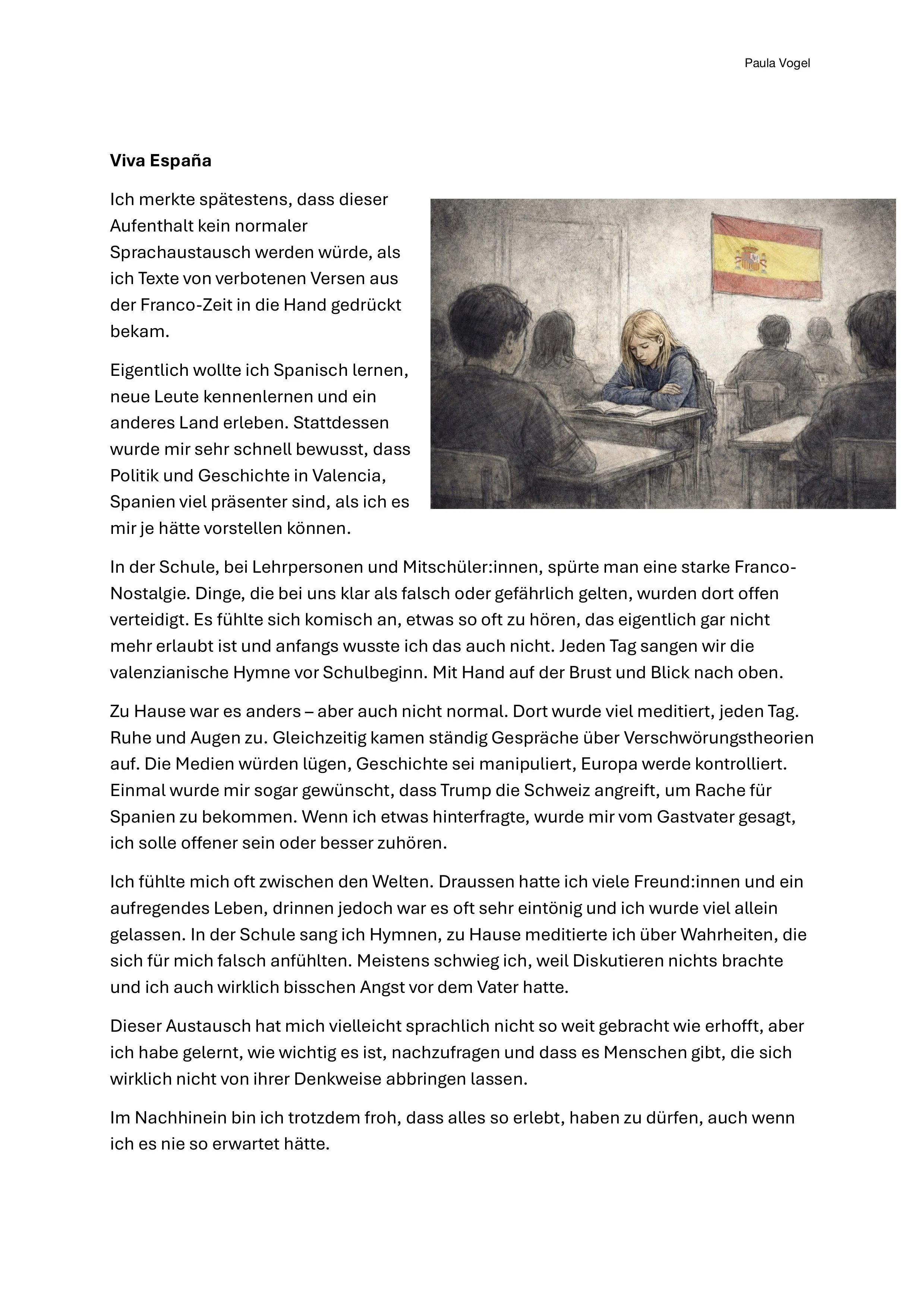 Viva España Text 12. Feb. Verfasst von Jean-Pierre Ritler Von Paula Vogel / Klasse 4c, Literargymnasiums Rämibühl, Zürich / Februar 2026 Jean-Pierre Ritler http://www.jprmedia.info