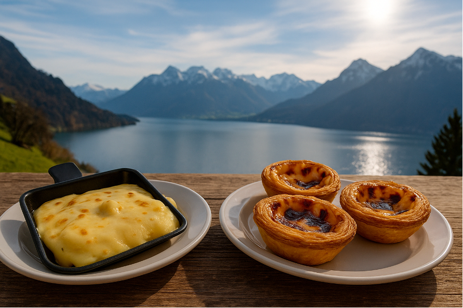 Raclette und Pastéis de Nata – beide Spezialitäten geniesst Emanuel Barros in der Schweiz. (Foto: mit KI generiert.)